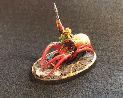 Matt - This is Paul's test model for his army of murderous Spiderfang Grots! I am really happy to see him pushing his painting standard and this can particulary be seen by the cleaness of the highlights around the joints of the spider. The green skin tone is also very nice with a yellowish ting which suits the smaller grots. I am particularly a fan of the basing, the effect is very well done and actually looks like volcanic rock - hopefully he will reveal the secrets of his basing in the future!