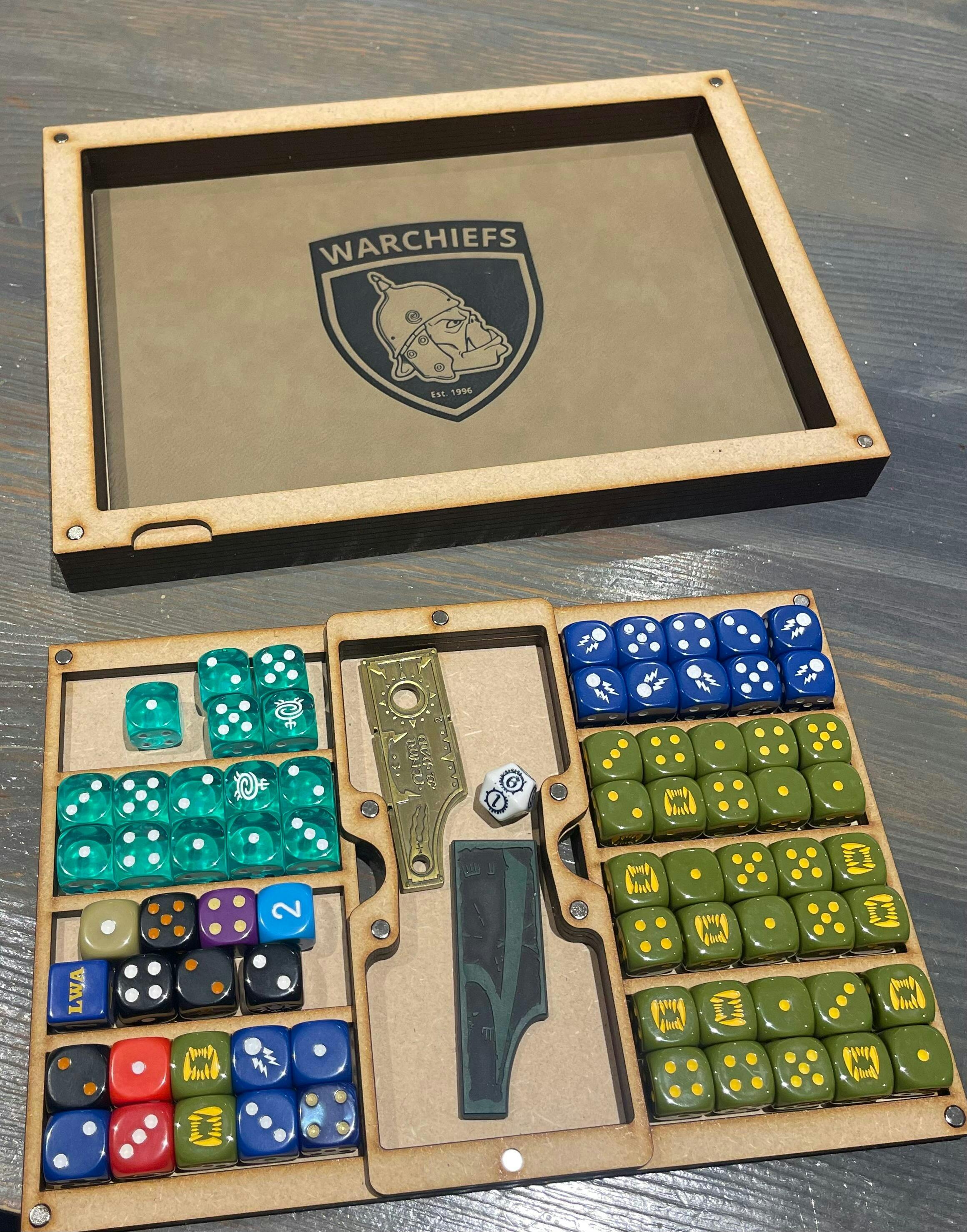 The Dice Tray and Storage box has been designed in layers of magnetised MDF to safely store your organised dice and miscellaneous gaming tools for transport and ease of access during games.