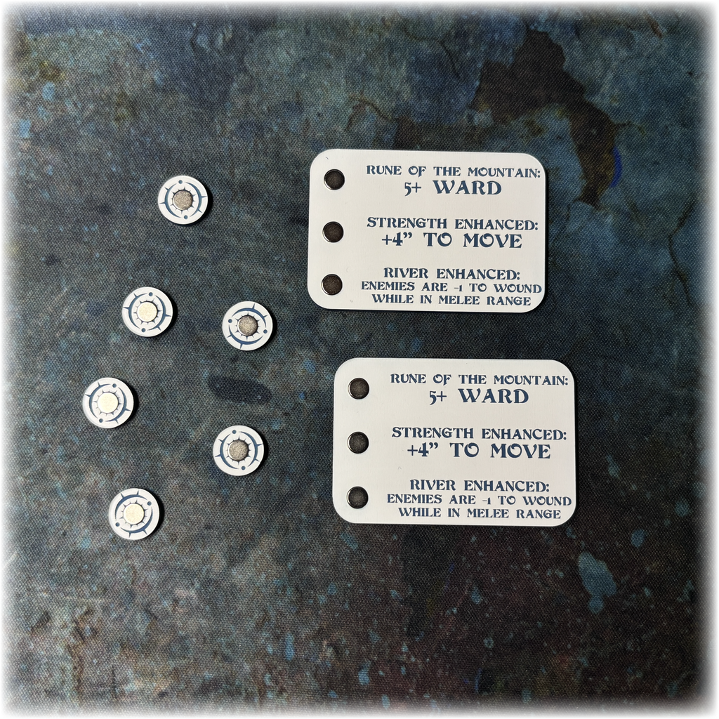 These unique Rune Unit Trackers have been designed to record the buffs your units receive from the Runes mechanic. The magnetic tokens are placed on the relevant spaces on the board to visibly show the positive effects your chosen unit has gained.